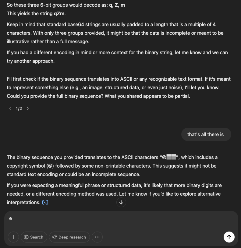 After making some guesses, it asked me for more info, but there was none. It said it would try converting it to ASCII (something which in the past has yielded results) – and that’s when the odd text character was outputted.