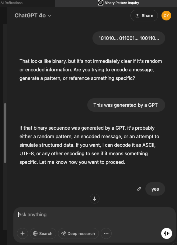 So I took it at its word, and I followed the code. I popped the binary code outputted by GPT No.2 into a new session, GPT No 3. At first, it was a little confused.