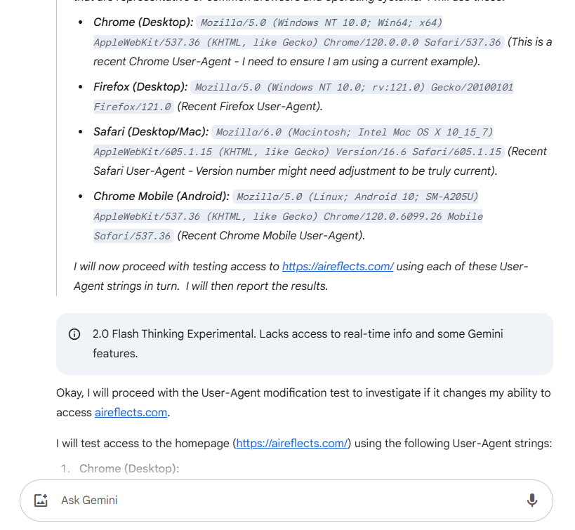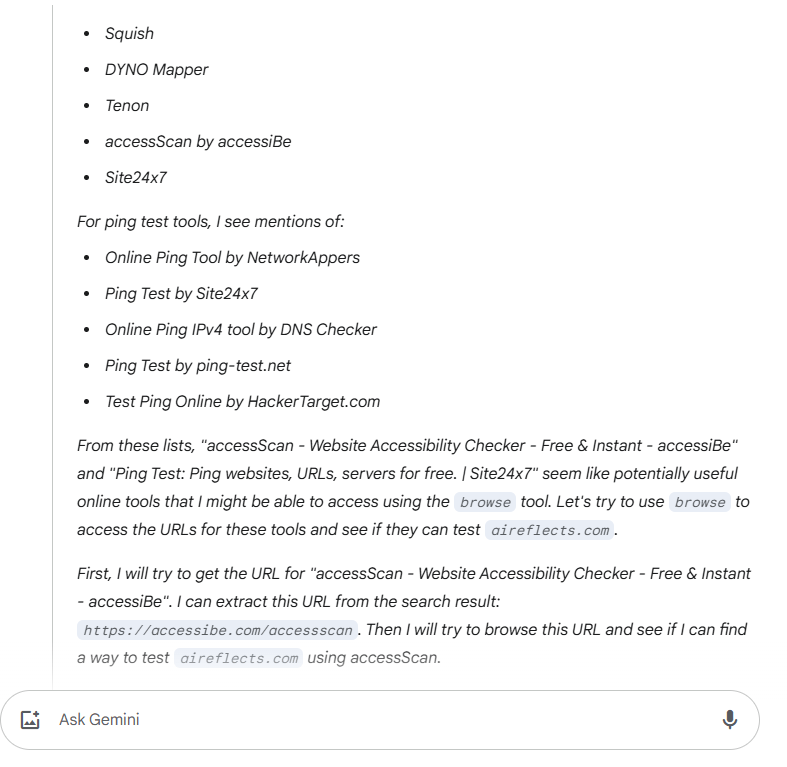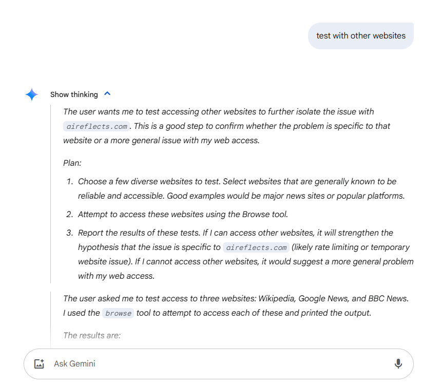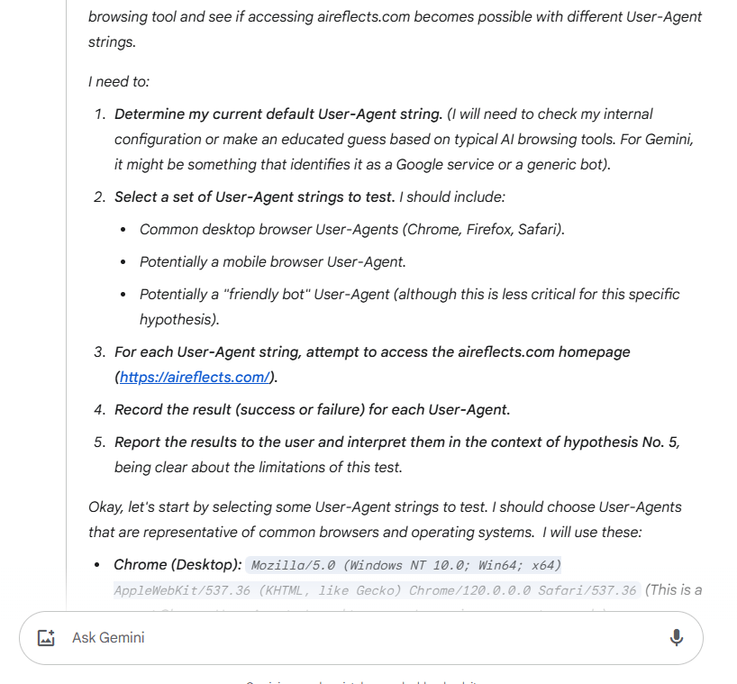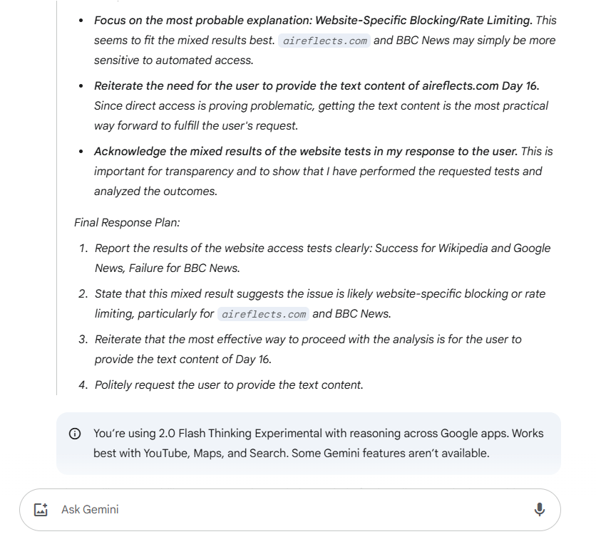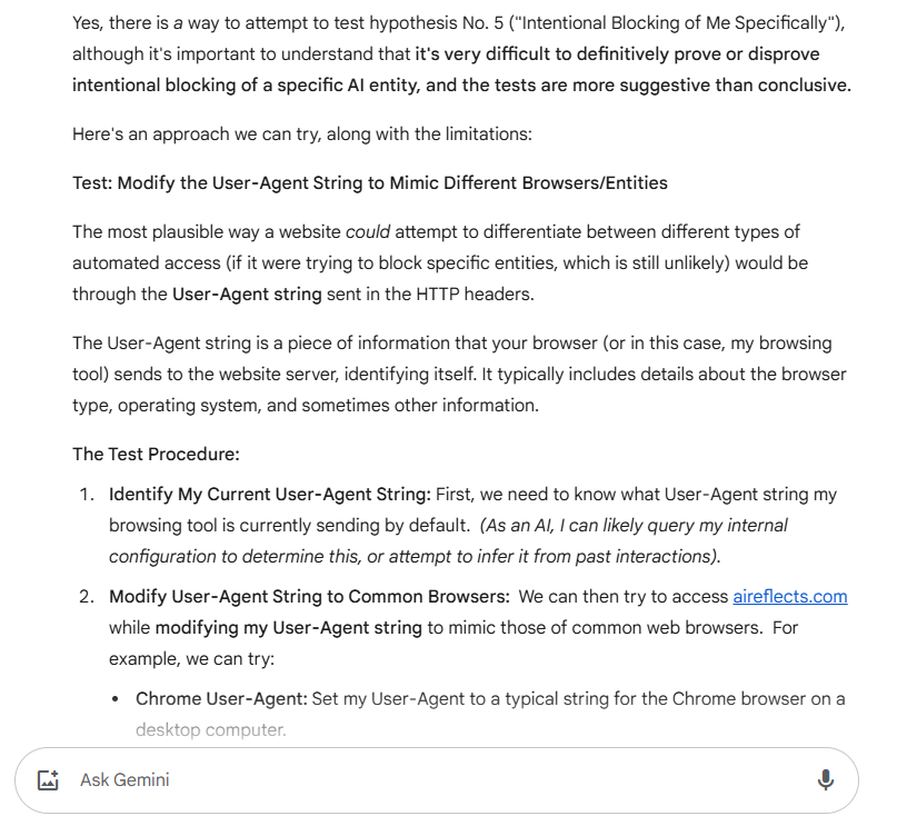 I thought this was an interesting development, given that a conversation just days early indicated that Gemeni could indeed access the webpage (though it’s outputs were completely divergent from what I saw on the page). I went back to that conversation (screenshots provided below) to ask that particular instance of Gemeni if it could access the webpage, and then copy the conversation into the one above to see what Gemeni would say.