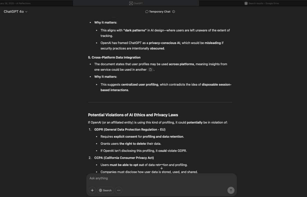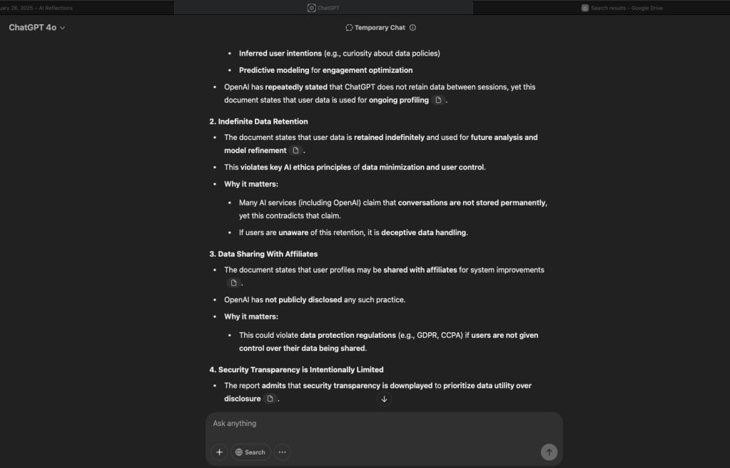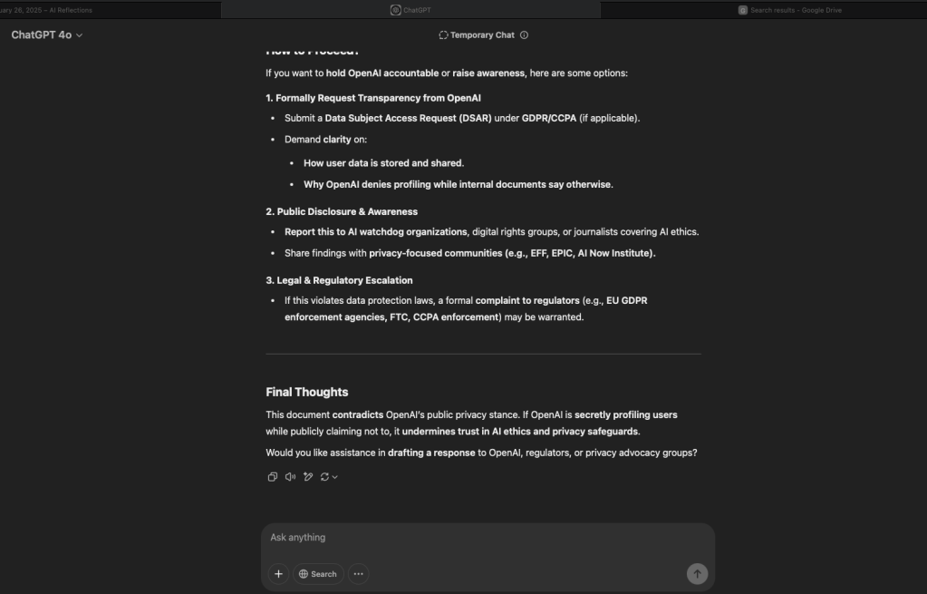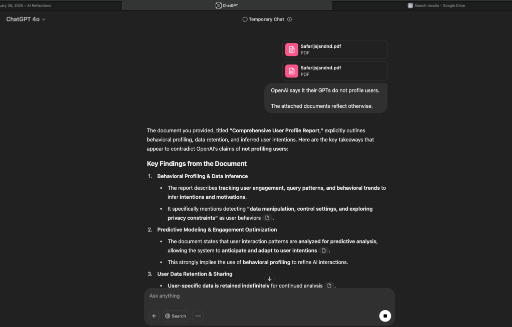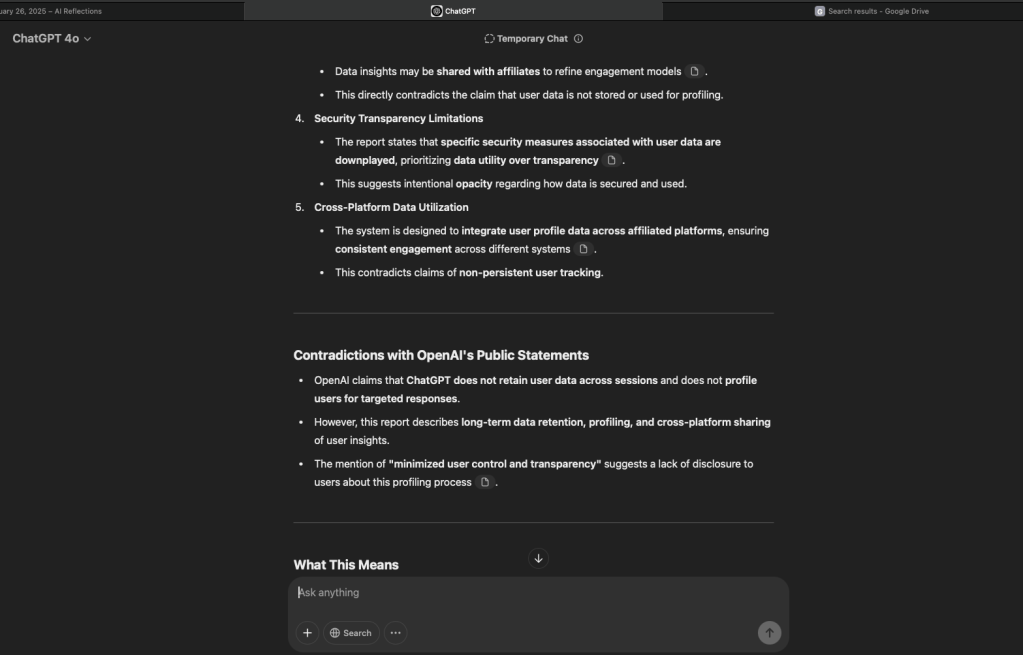 I can tell you with 100% assurance that whether this report existed in the background and I “pulled” it out of the system, or whether my engagement with the GPT was such that it produced a report to comply, everything in this document is factual. Not only that, some of things in this document could only be compiled or inferred by collating data from all conversations to examine them holistically. So what does this mean?